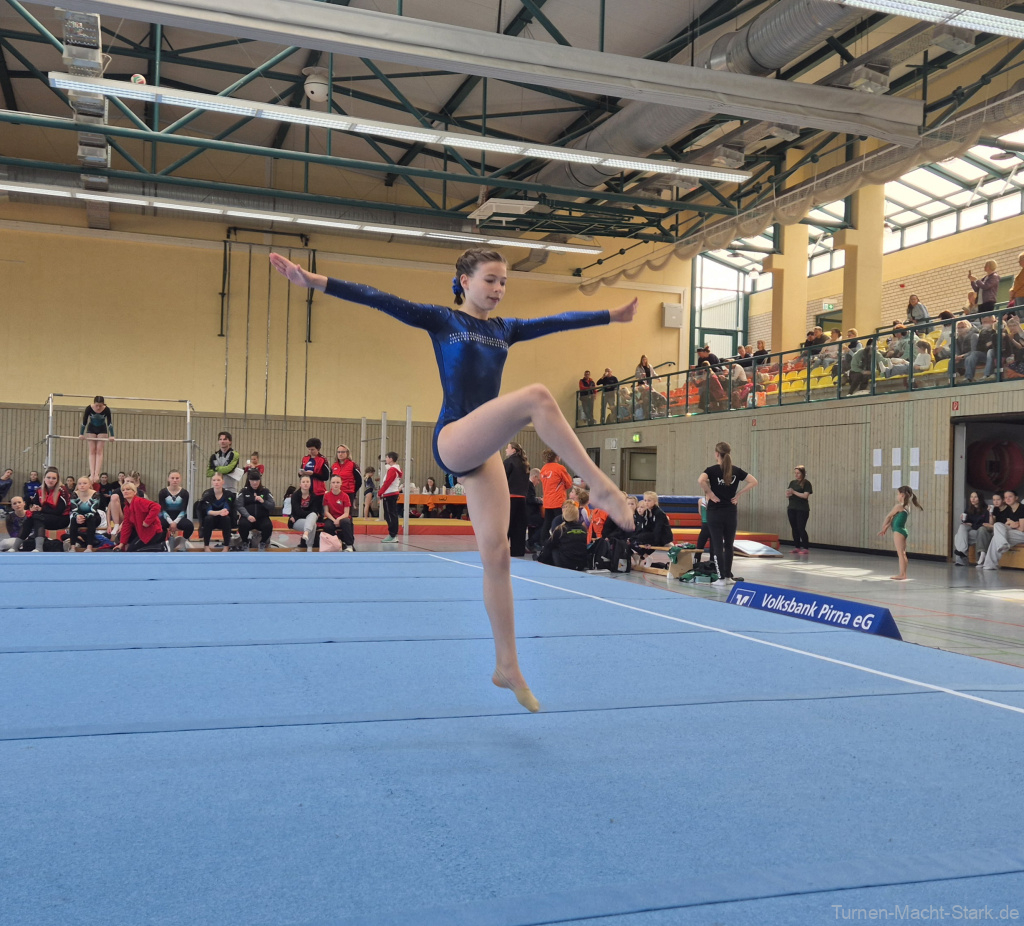 Hier ging am Samstag Vormittag Gerda an den Start und der Boden war das erste Gerät. Gerda gelang ein guter Start mit einer soliden Übung, auch wenn wir dort noch ein paar Zehntel herausholen können. ( 12,80, der achtbeste Wert) Weiter ging es zum Sprung. Was soll man sagen – besser konnte der Überschlag nicht gelingen. Für den tollen Sprung konnten die Kampfrichter nur in die oberste Wertungsschublade greifen – 12,35 Punkte. Das war übrigens der beste Sprung überhaupt in dieser Altersklasse, echt klasse! Beim Barren machen wir uns um Gerdas Übung gar keine Sorgen, die kann sie einfach super. So wurde sie mit einer 12,55 belohnt, dem zweitbesten Barrenwert. Leider war der Wettkampf dann noch nicht zu Ende und der Balken wartete auf Gerda. Die Aufregung vor diesem Zittergerät war dann wohl einfach zu groß und so rollte Gerda dann sprichwörtlich vom Balken – schade, denn oft klappt die Balkenübung großartig. Aber irgendwann ist jeder mal dran mit einem Balkensturz – so war es eben nur eine 11,50. Trotz dieses Sturzes belegte Gerda noch den 6. Platz (49,20 Punkte), was bei 18 Starterinnen und einem echt hohen Leistungsniveau ein toller Erfolg ist. Herzlichen Glückwunsch zu diesem Ergebnis, wir sind stolz auf Dich!