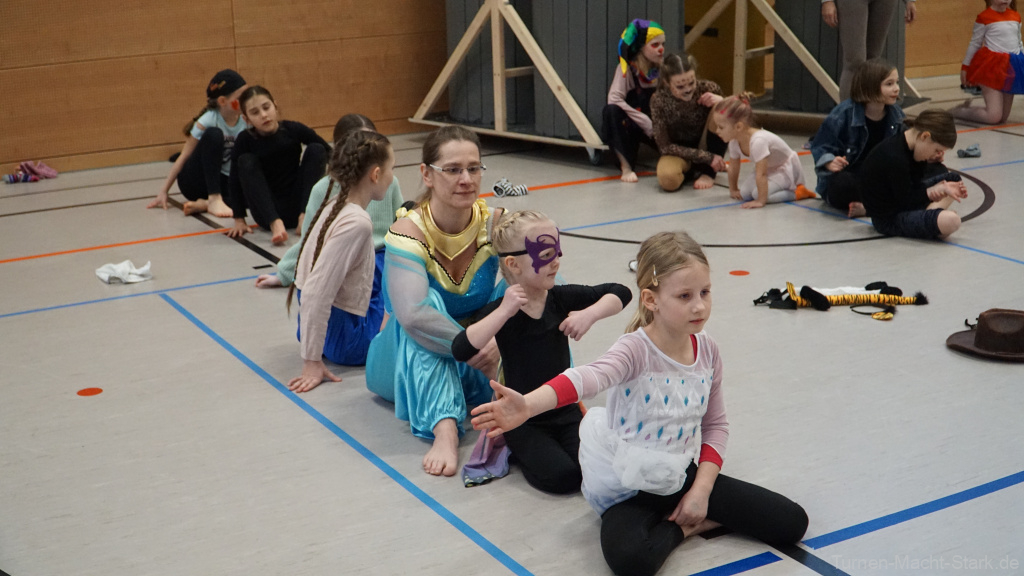 Immerhin 22 Kinder und 8 Übungsleiter stürzten sich in das bunte Treiben. Mit flotter Musik, Erwärmung, Polonaise und Reifentanz ging es los – Bonbonregen inbegriffen. Bei den nun folgenden Wettspielen ging es hoch her und alle gaben ihr Bestes. Danach probierten sich die Mädels alle an drei Stationen aus – Minitramp mit tollen Sprüngen in bunten Kostümen, Balken mit Wettspielen und Geschicklichkeit sowie dem lustigen Topfschlagen.